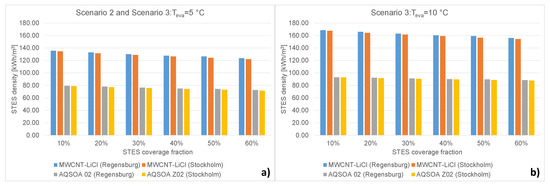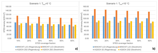 STES energy density calculated for Scenario 2 corresponding also to Scenario 3 with evaporation temperature set at 5 °C (a) and Scenario 3 with evaporation temperature set at 10 °C (b), for the identified working pairs (i.e., MWCNT-LiCl/water and AQSOA 02/water), both in Regensburg and Stockholm.