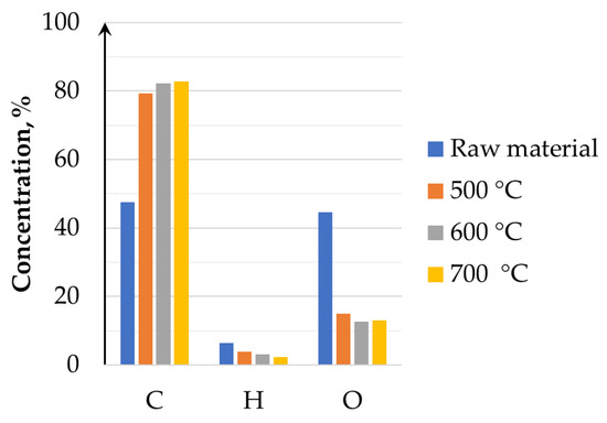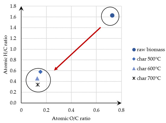- The solid phase (biochar) obtained during the pyrolysis process is a valuable energy carrier with good combustion properties of a high carbon content and lower VM in comparison to the raw biomass. The analysis of studied temperature range allowed us to conclude that a temperature increase leads to the production of biochar with a higher carbon content and lower VM, as the gaseous phase of biomass was processed and converted into syngas. Biochar mimics the properties of coal. Its high carbon content enables an effective combustion process, which is also reflected in the calculated main combustion parameters.