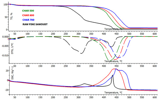 3.1.2. Thermogravimetric Analysis of Combustion Properties of Pine Sawdust and Chars