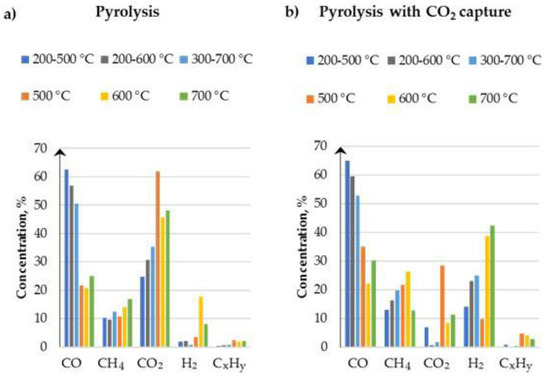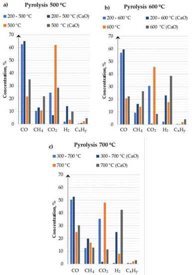 - The addition of a sorbent such as CaO for CO2 capture improves the final gas composition. The presence of sorbent allows the capture of carbon dioxide from produced syngas. As the process temperature increases, the concentration of CO2 in syngas decreases. The conducted tests and analysis prove the ability of capturing the CO2 released during the pyrolysis process and transforming it into a carbonate phase by CaO. The processes of tar cracking are promoted by the presence of CaO with parallel removal of CO2 and lead to an increase in H2 production.