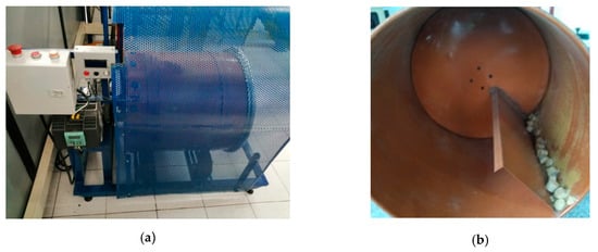 The briquette durability test was based on the European standard UNE-EN ISO17831-2. Under this standard, a rotating drum of 598 mm in diameter and length is used, with an internal flange that lifts the briquettes internally and drops them during rotation. The test speed is 21 rpm with a duration of 300 s [19,20]. The samples are extracted from the drum and are sieved using a mesh 2/3 of the diameter or diagonal of the briquettes (square sections 20 mm side). The mechanical durability index (DI, in percentage) was calculated as the ratio between the sieved mass after the test (mA) and the initial mass of the briquettes (mE), using Equation (2).
