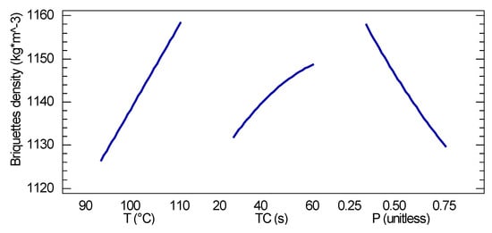 The three experimental factors, process temperature, compaction time and proportion of rice husk in the total biomass mixture, were statistically significant for a 95% confidence level; however, no interaction between the experimental factors was statistically significant [24]. The adjusted correlation coefficient of the model was equal to 65.8%, while the average absolute error was 14.4 kg·m−3. The equation that models the behavior of the briquettes density (ρb) based on the coded independent variables considered is shown in Equation (3),