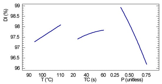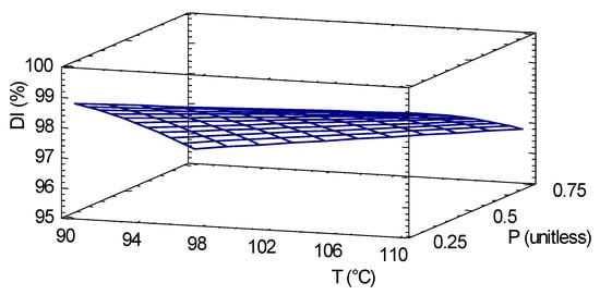 ANOVA statistical analysis for the mechanical durability index is shown in Table 7. The two experimental factors, temperature process and ratio of rice husk in the total mixture of biomass, were statistically significant to a confidence level of 95%; however, neither compaction time, nor interactions between experimental factors were statistically significant. The adjusted correlation coefficient of the model was equal to 81.1%, while the average absolute error was 0.41%. The Equation (4), shows experimental statistical fitting for the behavior of the mechanical durability index (DI) measured experimentally.