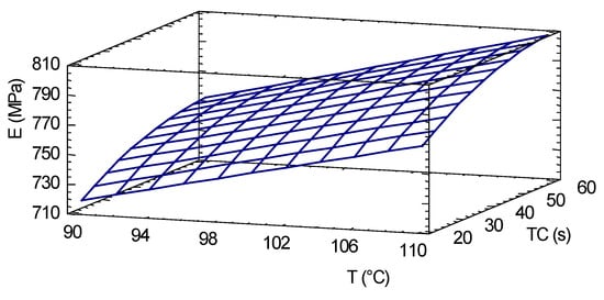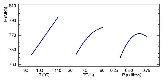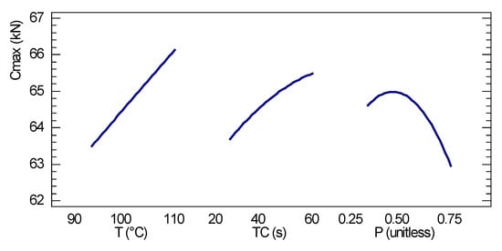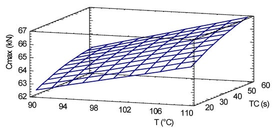 Figure 6 presents the main effects of the independent variables on the maximum compression load. Figure 7 shows the response surface for maximum compressive strength, where the temperature is observed as the most significant variable, taking the compaction time as the second factor to visualize the response surface behavior. The response surface has the highest growth gradient in the direction of higher process temperatures and compaction times, respectively.
