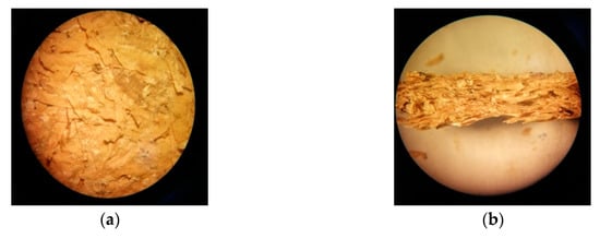 Microscopy images are showed in Figure 11, allowed to determine in a general way how the densification of the briquettes was given. They show the difference in particle size, in which sawdust forms granules and acts as a matrix, while the husk is intertwined and interacts to join the particles. The first thing that stands out is the configuration of the briquette structure, where they appear to form layers in a transverse direction as sheets that are interlaced and joined by different phenomena of agglomeration, mechanical entanglement and solid bridge links. In some cases, certain glassy coatings can be observed on the particles, possibly formed by the lignin that acts as a binder of the particles.