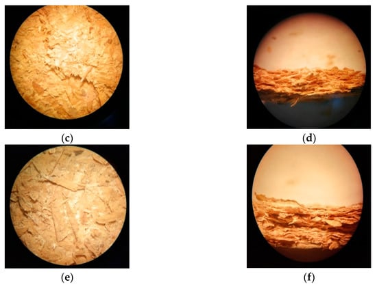 Microscopes for briquettes type (a) code AIL in briquette cross section, (b) AIL in briquette longitudinal section; (c) AIIIL in briquette cross section, (d) AIIIL in briquette longitudinal section; (e) CIIIH in briquette cross section; (f) CIIIH in briquette longitudinal section.