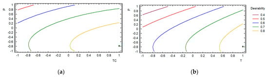The contours of the response surfaces for the composite desirability function are shown in Figure 12, (a) for temperature maintained at 110 °C, and (b) for a compaction time maintained at 60 s, in which the coded experimental factors in the axes are used. The green dot on the graphs indicates the maximum of the composite desirability function.