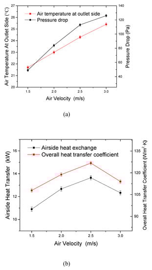 Figure 8 shows the variation in the air outlet temperature, MHE air-side heat transfer and overall heat transfer coefficient, and condensate rate under different air velocities. The inlet air temperature and relative humidity were set at 33 °C and 60%, respectively. The air velocity varied from 1.5 to 3.0 m/s in steps of 0.5 m/s. As shown in Figure 8a, both the air outlet temperature and air-side pressure drop increase with increased air velocity. As the air velocity increased from 1.5 m/s to 3.0 m/s, the air outlet temperature increased by 3.7 °C. This rise in the air outlet temperature was mainly because increasing the air velocity increased the air mass flow rate across the MHE and reduced the heat transfer time as the air flowed through the MHE. The air-side pressure drop was found to be increased by 61.1%. This was mainly caused by the high speed of the air.