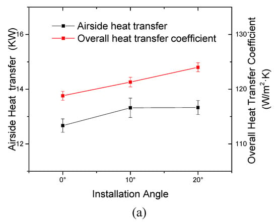 Figure 10a shows the air-side heat transfer and overall heat transfer coefficient under different inclined installation angles in the vertical direction. It was found that the total heat transfer did not change significantly, while the overall heat transfer coefficient increased slightly as the inclined installation angle increased from 0 to 20 °C. This increase in the overall heat transfer coefficient might be due to the condensate aggregation rate. As the inclined angle increased, the condensate aggregation rate decreased as the condensate dropped to the collection plate due to the gravity force. This can be evidenced by the pressure drop, as shown in Figure 10b. In Figure 10b, the air outlet temperature decreased as the inclined installation angle increased. This indicated that the air-side heat transfer increased as the inclined installation angle increased from 0 to 20 °C. As shown in Figure 10c, the condensate water accumulation rate did not change significantly if the measurement error was considered as the inclined installation angle changed from 0° to 10°. However, the condensate accumulation rate reduced substantially from 1.01 to 0.55 g/s as the inclined installation angle changed from 10° to 20°. This was because the inclined installation enhanced the condensate removal rate caused by gravity.
