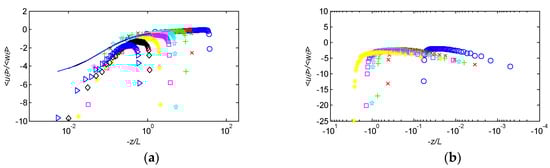 is the kinematic virtual temperature flux at the surface, is a reference virtual temperature, and is the gravitational acceleration. expresses the relative roles of shear and buoyancy in the production/consumption of turbulence kinetic energy with positive and negative values indicating stable and unstable conditions, respectively, and it approaches zero in the limit of neutral stratification. For , positive and negative values indicate unstable and stable conditions. In this study, 17 different turbulent boundary layer cases were analysed, from case 1 to 17 which range from stable to unstable, with = −98.27 (case 1), −16.19 (case 2), −2.29 (case 3), −1.15 (case 4), −0.84 (case 5), −0.63 (case 6), −0.35 (case 7), −0.05 (case 8), 0 (case 9), 0.54 (case 10), 1.01 (case 11), 1.79 (case 12), 3.16 (case 13), 4.48 (case 14), 8.13 (case 15), 11.31 (case 16), and 31.46 (case 17). It should be noted that to represent the average stability of the turbulent boundary layer, the used for calculating here is the boundary layer height ; this is different from Figure 1 and Figure 2 in which represents the level height above the ground.