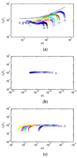 where is the friction velocity, represents the Obukhov length, and z is the height above the ground. It can be seen that remains constant under slightly or moderately unstable conditions but increases with increasing height under strongly unstable conditions. The simulation results show good agreement with Equation (8) which means that obeys Monin–Obukhov similarity theory under unstable conditions, fitting well with the 1/3 power law. Under neutral conditions, is constant, independent of height and equal to 1.32 (shown in Figure 2b); indeed, a large number of observations show that under neutral conditions, should be constant [58,60,61,62,63,64]. In particular, Bowne and Ball [60] and Counihan [61] both concluded that this constant value is 1.3. Roth [64] summarized the values of different researchers, which ranged from 1.1 to 1.7. When the turbulent boundary layer is under stable conditions, the turbulent motions are weakly connected to the ground, and the height is no longer a similarity parameter of this motion, except in the region near the ground. As can be seen from Figure 2c, the normalized standard deviation of the vertical velocity component behaves as expected for stable conditions. Also, similar to the ratio of horizontal and vertical heat fluxes, the peak of shifts to smaller as stability increases, except for neutral conditions; this is related to the upper location of thermal plumes.