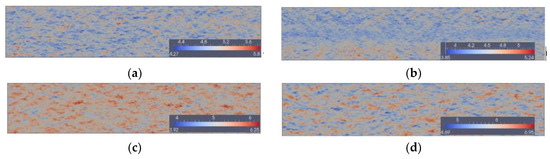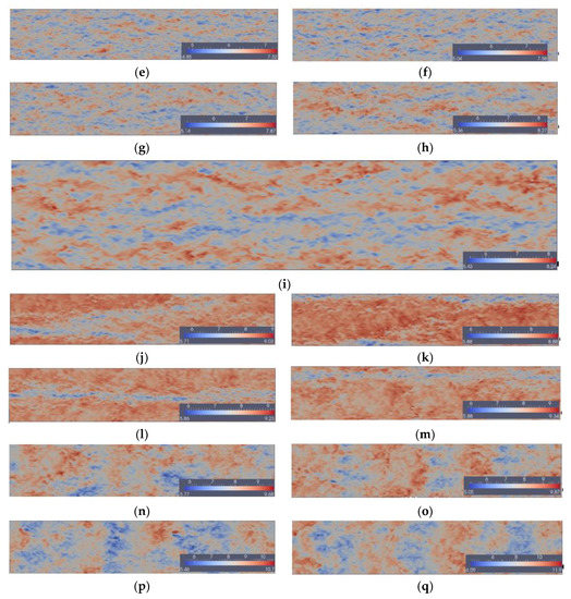 We now turn to an analysis of the flow field with the aim of providing a more intuitive view of its basic characteristics and those of the turbulent eddy scale. We consider a horizontal plane (whole domain) at the height of . Figure 3 shows the flow field for all 17 cases. On the whole, under stable conditions, the dominant turbulent eddy structure was small which is consistent with many previous results [31,33,34]. This is because, under stable conditions, the ground temperature is lower than that of the near-surface flow, and the vertical development of the turbulent eddy structure is limited which suppresses the development of three-dimensional turbulent eddy structure thus small-scale motion is prevalent. The dominant turbulent eddy structure scale increases as the stability decreases, and for the weakly stable condition in case 8, very-large-scale motion structures [8,10,65] even occur, just as under neutral conditions. It is obvious under neutral conditions that both large-scale and very-large-scale motion structures are visualized, based on the streamwise-elongated volumes associated with negative streamwise velocity, which is consistent with the results of Dennis and Nickels [66,67], Lee and Sung [65], Baltzer et al. [68] and Lee et al. [54]. Under slightly and moderately unstable conditions, obvious large-scale horizontal roll vortices form which are usually attributed to the combined effects of shear and buoyancy [21,22,24]. These can be seen as corresponding to the extended turbulent eddy structure that appears under neutral stability conditions. Under strongly unstable conditions, the effects of buoyancy dominate those of shear, so there is an obvious distinction between low-velocity and high-velocity regions which extends over the whole spanwise direction. This is consistent with the experimental results of Hommema and Adrian [25].