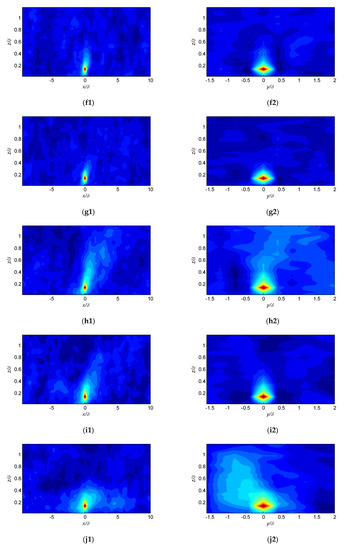 To quantify the size characteristics of the three-dimensional turbulent eddy structure under different stability conditions, a flow field correlation analysis was performed with reference location . Figure 4 presents contours of the spatial correlation coefficient for all 17 cases. The plots in the left column are for the plane, and those in the right column are for the plane; thus, it is possible to visualize the three-dimensional turbulent eddy structure. The conclusion is similar to that from the flow field analysis, namely, that with increasing stability, the dominant size of the turbulent eddy decreases. This clearly shows that under weakly stable, neutral and slightly and moderately unstable conditions, very-large-scale motion structures appeared, while strongly unstable conditions led to thermal plumes. Meanwhile, an interesting phenomenon was that the spanwise size of the dominant vortices remained almost constant, except under strongly unstable conditions which may be due to the fact that the effect of the shear force was mainly in the streamwise direction and that of the buoyancy force was mainly in the wall-normal direction; however, under strongly unstable conditions, the temperature of the ground was higher than that of the adjacent near-surface air, and so the buoyancy force had a positive effect on the upward motion of air near the ground in the whole spanwise direction. The spanwise and wall-normal velocity correlations were different from the streamwise velocity correlation. For the spanwise velocity correlation under stable conditions, the spanwise size of the correlation structure was smaller than the streamwise velocity correlation; moreover, the degree of tilt was smaller than for the streamwise velocity correlation. Under unstable conditions, even light unstable conditions, the plume-shaped structure occurred, meaning that this structure form occurred earlier than the streamwise velocity correlation. For the wall-normal velocity correlation, from stable to unstable conditions, the spanwise and wall-normal sizes of the correlation structure became wide and deep which is very different to the other two direction velocity correlations. These results are not shown here.