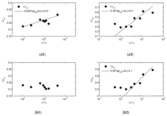 Figure 5 shows the size of the turbulent eddy structure under different stability conditions at a height of . The distances , and are defined in Christensen and Wu [69] and Volino et al. [70] as twice the distances from the self-correlation peak to the most distant locations on the 0.5 contour of the two-point correlation of the fluctuating velocity in the downstream, spanwise and wall-normal directions, respectively. We can see that under strongly and moderately stable conditions, the streamwise extent increased in a log-linear manner as increased, and that it behaved similarly under strongly unstable conditions. However, under near-neutral stability conditions, was independent of and remained constant at approximately 0.3. Similar behaviour was found for the wall-normal extent which remained constant at approximately 0.1. From strongly stable through neutral to slightly unstable conditions, the spanwise extent remained constant at approximately 0.2, while under strongly unstable conditions, also increased in a log-linear manner with increasing . This corresponds to the behaviour of the spatial correlation coefficient field.