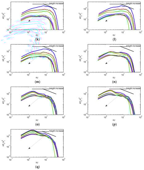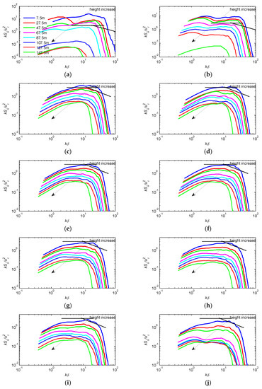 Pre-multiplied spectral analysis is a popular approach for determining the distribution characteristics of vortices of different scales in canonical wall-bounded flows [8,10,71,72]. Figure 6 shows the multipoint averaged [73] pre-multiplied wind velocity spectra for all 17 cases. As we know, the most energetic point in the pre-multiplied wind velocity spectrum represents the dominant turbulent eddy structure. Therefore, under stable conditions, the peak wavenumber of the wind velocity spectrum is located in the high-wavenumber region which indicates that the dominant vortices are small. With decreasing stability, the peak wavenumber moved to smaller values which means that the size of the dominant turbulent eddy structure increased and very-large-scale motion structures occurred under the slightly stable conditions of case 8. Here, it should be noted that very-large-scale motion structures are those with turbulent eddy size larger than . Under near-neutral stability conditions (slightly stable, neutral and slightly unstable conditions), the stationary stage of the pre-multiplied wind velocity spectrum has a large width, because the stationary stage corresponds to the very-large-scale motion structure [6,8,10,12]. Under strongly unstable conditions, the peak wavenumber is located in the small wavenumber region which means that the dominant turbulent eddy structure is very large, and the shape of the wind velocity spectrum is similar to that of a typhoon wind velocity spectrum near the eye-wall region. This may be because the eye-wall region of a typhoon is also characterized by strongly convective conditions, accompanied by a strong updraft. For spanwise and wall-normal pre-multiplied wind velocity spectra, the maximum energy points are consistent with the streamwise pre-multiplied wind velocity spectrum, and as the instability increases, it moves to a small wavenumber. The difference is that the steady stage is more obvious in the streamwise pre-multiplied wind velocity spectrum than the other two directions, and that the spanwise and wall-normal pre-multiplied wind velocity spectra have obvious cross-over phenomenon at different heights, which does not occur for streamwise pre-multiplied wind velocity spectrum. These results are not shown here.