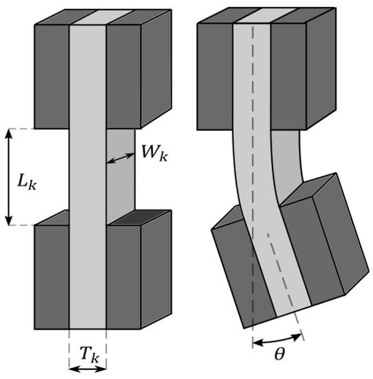 Flapping wing MAVs operating at resonance have the potential to consume significantly less energy then non-resonant systems. This has widely been used to achieve lift in several systems as it allows all mechanical power to be realised as aerodynamic propulsion that appears to the system as damping of the wing and mechanism [1,5,7]. However, it has been observed that in highly maneuverable insects such as dragonflies, the measured frequency can change from 29.2–47.5 Hz [13]. This wide frequency change can lead to instances where resonance would have detrimental results for control and glide speed [14]. Most of the artificial systems presented are designed to operate in a very narrow frequency range. This allows the positive benefits of resonance to have its greatest effect by reducing power requirements. This reduction is due to the elasticity of the system converting the inertial energy into potential energy every wing beat. The natural frequency thus describes the point of which the elasticity and inertia of the mechanism are balanced. For a typical flapping wing MAV, this means tuning the stiffness of the mechanism to the design of the wing and the desired operating frequency. This theory has successfully been employed in flapping wing MAVs that have used piezoelectric actuators, as the actuator provides the mechanical stiffness to the mechanism. Electromagnetic actuators do not have this ability and must instead rely on the stiffness of the mechanism. Micro-robots have utilised compliant mechanism as the use of sliding, or revolute joints would be inefficient in micro-articulated structures [15]. This design requirement means incorporating both flexible and rigid structures together to create the desired mechanism. The stiffness of these compliant mechanisms shown in Figure 2 can be estimated by Equation (7), where ,, and are the modulus, thickness, width and length of the deforming layer. The rotational inertia of the system must be calculated to determine the natural frequency of the system. The components that contribute to this are the wings, mechanism and magnet actuator. For the example recreating the results of Zou et al. [8] the contribution of the magnet and mechanism is significantly less than the wing and will not be included in the natural frequency estimate. Equation (8) determines the natural frequency of a mechanical system.