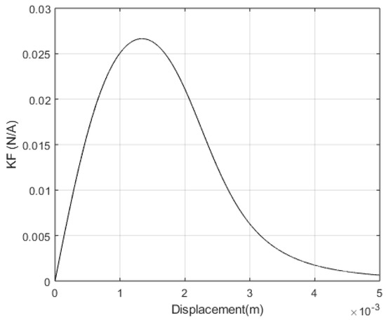 Combining Equations (5) and (9) and summing the result for both the north () and south pole () of the magnet the resultant force can be calculated. The actuators parameters are shown in Table 2 have been collected from the information reported by Zou et al. [8]. These values are used to define the dimensions labelled in Figure 3 which are required for the force calculations. These parameters results in the force profile() shown in Figure 4. This plot shows the amount of force the actuator can generate at 1 amp for a displacement range from 0–5 mm. This shows that when the magnet is centred within the coil (0 mm displacement), the actuator cannot generate force. The mechanism zeroed where the actuator achieves peak force to maximise the force output for the entire stroke of the magnet. Required current to be applied to the actuators can thus be solved for a given force assuming there is an appropriate feedback mechanism that can determine the location of the magnet within the coil. Equation (13) calculates the required coil current to generate the actuators force, , given the force profile and location of the magnet.