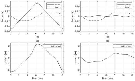 Utilising the parameters of the wing, actuator, mechanism and kinematics outlined in Table 1 and Table 2 the resulting moments generated by the wings and elastic mechanism can be calculated over a flapping cycle. Combined with the force model of the actuator, the current, back emf, voltage and power can be calculated. This simulation shows that with the mechanism and actuator reported by Zou et al. [8] the average power consumption is calculated to be 1.17 W. This is compared to the approximate 1.2 W of power that was documented by the authors. This gives an actuator mechanical power efficiency of 0.34%. It is thus demonstrating that a significant amount of the electrical power delivered is being dissipated as heat. From the analysis of wing inertia and stiffness of the mechanism, it can be observed that the natural frequency of the system is much lower than the operating frequency. This causes a greater need for the actuator to accelerate and decelerate the wings each flapping cycle which requires a large amount of force at the times of the stroke when the velocity is the lowest. The low velocity and high force requirements translate to minimal developed mechanical power which is observed as a 30% increase in the mechanical power generated by the actuator. Figure 5a shows the calculated force the actuators is required to developed from the simulated aerodynamic and inertial moments that through a flapping cycle. This figure shows that with the low natural frequency, the peak force requirement from the inertial component is over twice that of the aerodynamic component. This causes the actuator to generate high forces that contribute to very little mechanical power yet dissipates large amounts of electrical power. The resonant case is also shown in Figure 5b shows that the inertial component is almost completely removed. The only remaining component of this is due to the non-linear translation of the magnet actuator. This ensures that most of the mechanical power being developed is utilised by the aerodynamics of the system. Figure 5c,d shows the electrical current profile of the two cases. Figure 5c shows the electrical current is out of phase with the aerodynamic force and in phase with the inertial force shown in Figure 5a. The resonance case shown in Figure 5b,d shows that with the reduced inertial component the electrical current waveform is changed to become in phase with the aerodynamic damping. This change corresponds to a more efficient system that is able to convert a higher proportion of electrical power into aerodynamic power. This change has led the calculated input electrical power consumption to be reduced from 1.17 W to 0.155 W. This gives over a 7 times reduction in electrical power requirements. This is done by only decreasing the mechanical power requirement by 30%.
