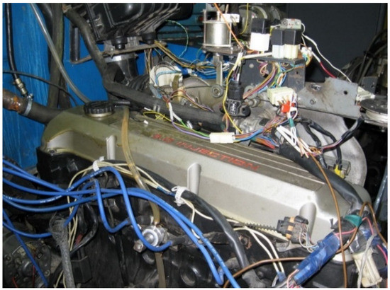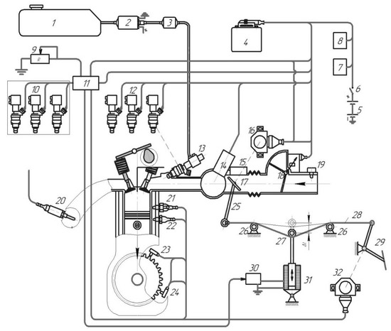 The experimental model of a fuel supply system to implement the combined power regulation method is based on a Bosch “Motronik ML 4.1” (“Robert Bosch GmbH”, Gerlingen, Germany) fuel supply system in the mechanical drive throttle. The scheme of the experimental system is shown in Figure 4 [20]. The main algorithm of its operation implies the termination of the fuel supply to the switched-off cylinders without changing the gas exchange in small loads and idling modes. The engine is equipped with the new system without structural changes in the electronic control unit of the injection system and engine ignition. It can, therefore, be installed on vehicles in operation. This system of power regulation has five patents in the Ukraine for utility models [35].