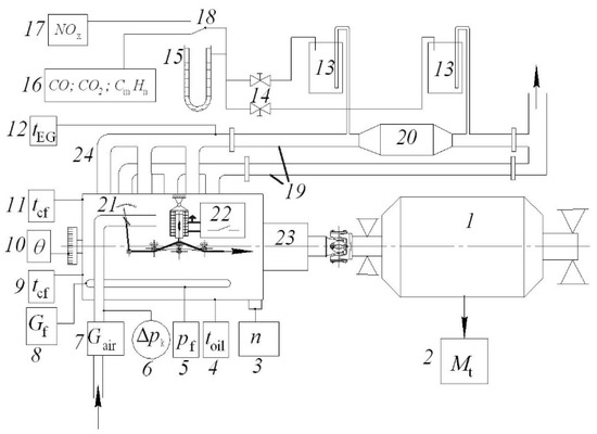 The engine has been installed on a universal brake stand SGEU-100 with an electric brake AKB-92-4, the power of 100 kW and a maximum rotation 3000 rpm. The installation enables testing the engine in wide limits of external loads. The schematic diagram of the experimental installation with measuring devices is shown in Figure 5.