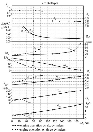 Figure 7 shows the load characteristics of the engine for its operation with three and six cylinders at n = 2600 rpm. Hence, it is evident that throughout all loads from idling modes and before the operation of the enrichment device, the stoichiometric composition of the fuel and air mixture is maintained, regardless of the number of working cylinders (λ = 1.0). When three cylinders are switched off in this high-speed mode, the maximum torque of the engine Mt decreases from 191 Nm to 84 Nm. For loads up to 65 Nm for three-cylinder engine performance there is an improvement in fuel economy compared to the operation with all cylinders, hourly Gf and brake specific fuel consumption (BSFC) is reduced by an average of 13%. At the same time, load reduction fuel economy improves. In idling modes for fuelling a three-cylinder engine, the fuel economy is about 19%. When the load Mt = 65 Nm, fuel consumption for the engine running on six and three cylinders is the same. At a larger load the engine operation with a group of switched off cylinders becomes less economical and therefore inappropriate. The operation of the engine with three cylinders compared to the operation with six cylinders is characterized by a larger opening of the throttle ϕdr, the lower thinning of Δpk, and larger volumetric efficiency of engine ηv, with practically the same air flow Gair.