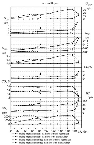 An analysis of the environmental performance of the engine indicates a significant increase in nitrogen oxide NOx concentration when the engine runs on three cylinders compared with the engine running on six cylinders. When applying a three-component catalytic converter, the NOx concentration in both cases is significantly reduced to practically the same level. Similar results were obtained by Ozhan et al. after years of research using multilevel flow modeling [56]. Concentrations of carbon oxide CO, carbon dioxide CO2, and hydrocarbons HC in the operation of the engine with catalytic converters with different numbers of working cylinders are also practically the same.