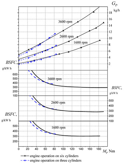 The improvement in fuel economy for the operation with three cylinders has been obtained in other high-speed modes (Figure 9); the engine load was low (Mt = 40 Nm).