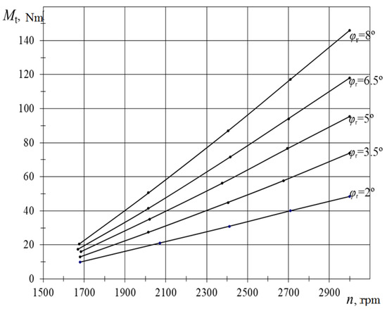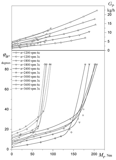Figure 10 shows the experimental dependencies of the hourly flow of petrol Gp and the opening angle of the throttle valve ϕdr on the torque Mt of a six-cylinder Opel C30 LE petrol engine with a distributed injection system with a feedback with six and three cylinders at different speeds.