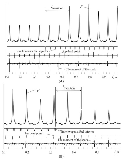 A similar process occurs with switching off the cylinders (Figure 11B). After the fuel injector stops working, the first operating cycle is without breaking the parameters of the operating process. The next one is without the combustion process. The duration of the transition process when switching off the cylinders lasts for about 0.1 s.