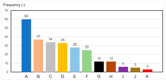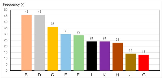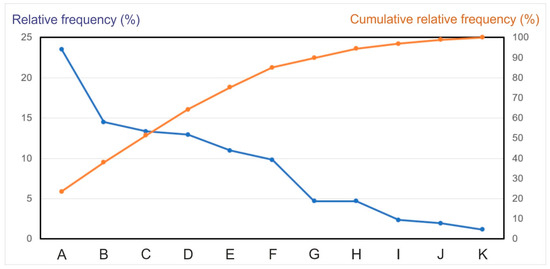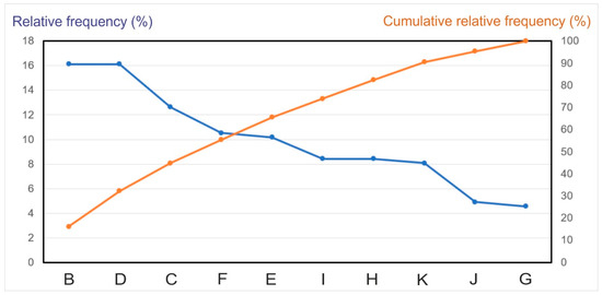 Now let’s look at the results of the second assignment process. Figure 4 shows how many papers have been assigned to each defined paper group in this assignment process. Figure 5 then presents the results of the same process using the relative frequency and cumulative relative frequency. Since the minimization of PS operation costs is the characteristic shared by the vast majority of PS OSs, group A was not considered as part of the second assignment process. Figure 4 shows that the highest number of papers has been assigned to group B (PS OSs optimizing the operation of renewable energy sources, 73 papers). Figure 5 shows that the four largest paper groups amount to more than half of all papers in our paper database (specifically, their amount is 55.6%).