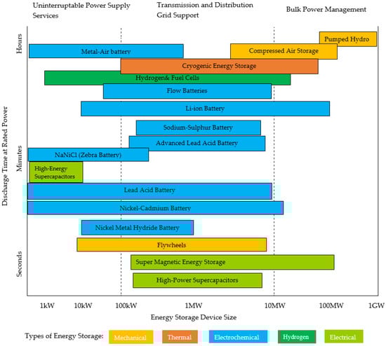 Classification of energy storage systems by the form of stored energy along with their power capacity, discharge time, and applications, adopted from [36].
