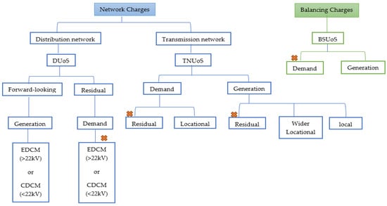 Network and Balancing system charges in the UK’s electricity system, adopted from [68]. (x) means removed for ES per new legislations.