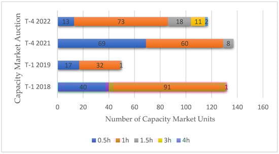 Before introducing the de-rating factors to ES in this market, its participation was not penalised according to its discharge capacity, which meant that all storage devices received full payment of the clearing price. However, due to de-rating factor changes, discussed in Section 3.4, BESS participation in this market has decreased. For instance, in the T-4 auction of 2018, only 158 MW of BESS have secured a contract compared to 500 MW in the previous auction [97]. As depicted in Figure 4, the number of 0.5 h and 1 h duration batteries decreased from 40 and 91 in T-1 2018 auction to 17 and 32 in the T-1 2019 auction respectively. Moreover, the number of 1.5 h duration batteries increased from 8 in the T-4 2021 to 18 in the T-4 2022. This is in line with first time appearance of 11 and 2 batteries providing 3 h and 4 h discharge duration, respectively. The decline in the shorter duration storage (0.5 h and 1 h) and the increase in longer duration storage (1.5 h, 3 h, 4 h) may be a result of other services commitments. However, it is an indication of a regulatory change that encourages the battery industry to increase its energy and power density by introducing higher payment for longer duration storage.