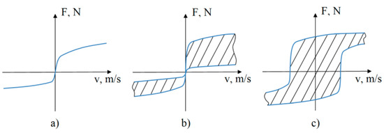 Active shock absorbers are equipped with an external source of energy so that these systems can generate forces on the rod, regardless of the unsprung mass displacement. The dissipative characteristics of passive, semi-active, and active shock absorbers are presented in their general forms in Figure 1a–c, respectively. The following notation is used in the figure: F—force on the shock absorber rod, N; v—rod movement velocity, m/s. As can be seen in Figure 1b, the set of dissipative characteristics of a semi-active shock absorber lies in I and III quadrants; thus, the force vector F is always in one direction with the velocity vector v.