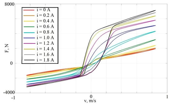 - The currents on the solenoid valves of the compression and rebound strokes , whose values lie in the range 0…1.8 A. Applying the current value to the valve changes its capacity. The values of the force on the shock absorber rod and the values of the speed of the rod always have the same sign. Thus, a shock absorber controlled only by the currents on the valves works as semi-active. The set of a dynamic dissipative characteristics of the shock absorber for different values of currents is shown in Figure 2. In Figure 2 and Figure 3, the following notation in used: force on the rod, —velocity of the rod, —control current, —hydraulic pump flow rate.