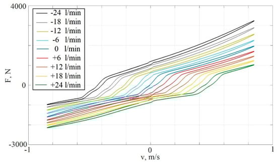 - The hydraulic pump flow rate Q lies in the range of −24…24 l/min, where the sign determines the direction of the fluid flow. The set of dissipative characteristics obtained for different values of Q are presented in Figure 3. A pump is essentially an external source of energy in the system, and thus it becomes possible to generate forces on the rod opposite to the direction of the movement of the rod. This is how the “active” property of the shock absorber is realized.