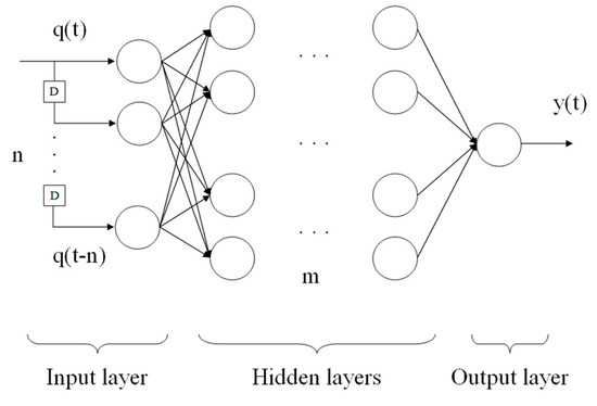 An artificial time-delayed neural network is in principle an extension of a multi-layer perceptron that allows time sequences to be taken into account to work with problems in which the signals are functions of time and previous values. In this case, the neurons had an interesting property of memorizing the sequence of values of the input signals. This property also made it possible to train NNs to approximate dynamic systems with hysteresis. A schematic diagram of the TDNN with time delays and hidden layers is presented in Figure 4.