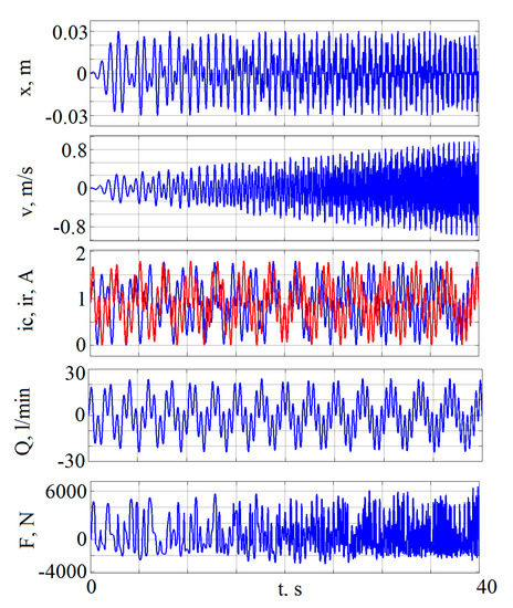 As can be seen from Figure 2 and Figure 3, the dynamic dissipative characteristics are substantially nonlinear. In addition, the hysteresis property can be seen in the system. It is also important to note the asymmetry of the hysteresis loops relative to the origin of coordinates. Thus, to develop an efficient and accurate control system, it is mandatory to take into account not only the instantaneous values of the states of the dynamic system, but their time series.