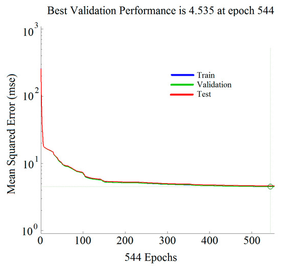 After 544 epochs, training stopped because 10 validation checks had been reached. The NN MSE performance is presented in Figure 7. The figure shows that with an increase in the number of training epochs, the MSE of the neural network decreased for all three phases (blue line for training, green for validation, and red for testing).