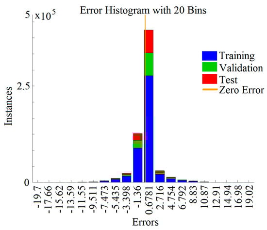 Figure 8 shows a histogram of errors with 20 bins. Similar to the previous dependency, blue, green, and red colors represent training, validation, and testing phases, respectively. It can be seen from the figure that the errors were distributed relative to zero.