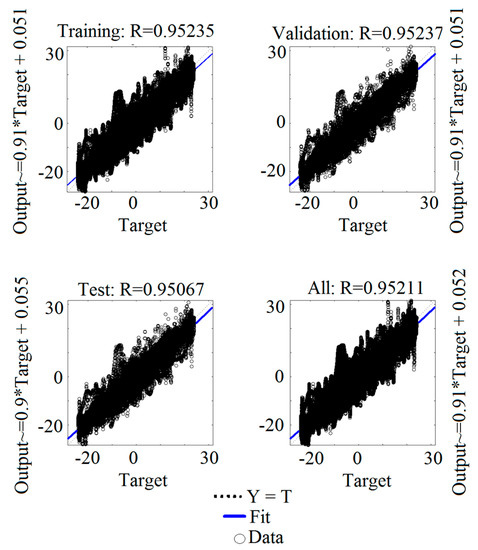 The graph in Figure 9 shows a regression analysis between the outputs of the NN and the desired targets. The solid line represents the best fit linear regression line between outputs and targets. The dashed line represents the best results (i.e., when targets were equal to NN outputs). The value is an indication of the relationship between the outputs and targets, taking values from 0 to 1, where 0 means no linear relationship, and 1 means an exact linear relationship. The overall value was 0.95211, so a strong relationship can be concluded.