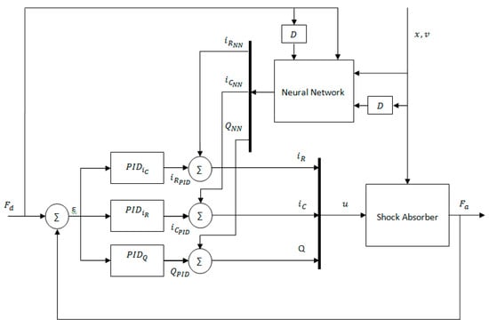 After the training process, the neural network is able to act as a controller. It can be said that the resulting neural network is an inverse dynamic model of the shock absorber, since the input variables of the shock absorber were the output of the neural network and vice versa. However, when using only a neural network in the control system, acceptable results can’t be achieved, because there is no feedback in such a system. For a feedback circuit, it is proposed to use the developed neural network together with other controllers that could compensate for inaccuracies in the NN approximation. The control system in this article is built using PID controllers. The PID control law is simple, and using it alone is not enough to precisely control the active shock absorber. However, the control system based on PIDs with the developed neural network shows good results. The architecture of the proposed control system is presented in Figure 10.