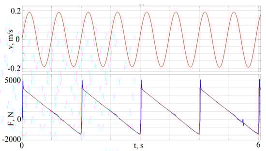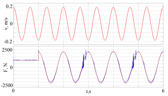 One of the main tasks in controlling active suspension is to provide the desired force in the form of a wave. In this case, the frequency and phase of the wave can be arbitrary with respect to the input periodic effect on the rod. The simulation results were presented when the displacement of the shock absorber rod is in the form of . In this case, we defined the desired value of the force to be specified as a chirp signal, with an amplitude increasing linearly from 1 to 3 Hz in 10 s. The gain of multiplication was 10,000. Since the dissipative characteristics were not symmetrical in the compression and rebound phases, the chirp signal was shifted up by 1500. The dependences obtained are shown in Figure 11. Discussions of the results are below.
