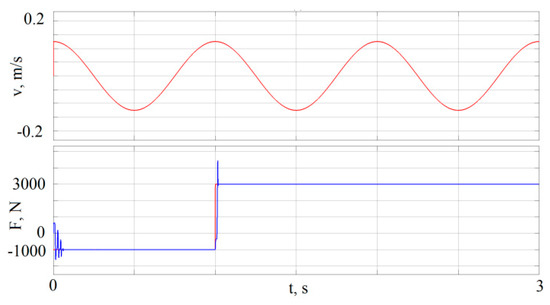 We selected the input of the shock absorber rod as in the previous scenario, but the frequency was increased to 1.5 Hz. The desired output value of the force on the rod was set as a wave signal with a frequency of 1 Hz and an initial delay of 1 s. The value of the force on the rod was equal to 1000 N. The results are shown in Figure 12.