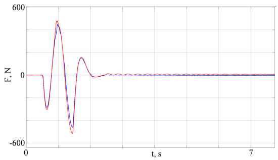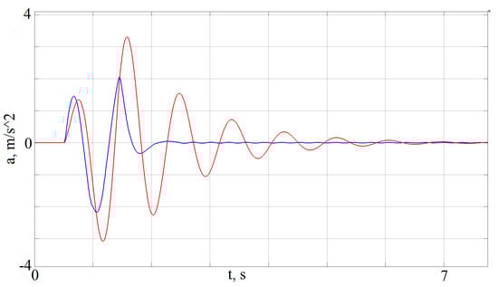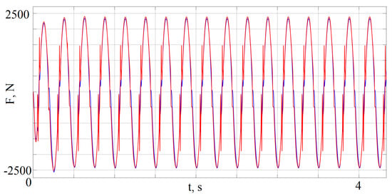 In Figure 17, graphs of the desired force (output of the PID controller, red line) and the actual force on the shock absorber rod (blue line) are presented. As can be seen from this figure, the developed controller of the active shock absorber provided, with an acceptable level of error, the realization of the desired force. Figure 18 depicts a graph of the vertical acceleration of the vehicle body with a passive shock absorber (red line), and an active shock absorber with a developed controller (blue line). The advantage of using active shock absorbers and the possibility of a significant reduction in the level of dynamic loads thus can be seen in Figure 18.
