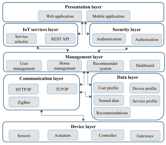 - Management layer. This layer performs and manages the actions to meet user requirements requested at the application layer. To this end, the IoT layer uses the REST API to ensure communication between the presentation layer and the management layer.