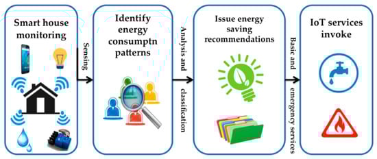 Matsui et al. [] presented a study on energy usage patterns to then propose an energy conservation action plan. To this end, the researchers gathered real-time data on energy consumption and indoor temperature in a Tokyo residential area using IoT devices and sensors. Then, the data were analyzed using three types of method: a clustering algorithm, a correlation analysis, and a classification of indoor temperature for detached houses with different building structure and ages, and condominium apartments. From a similar perspective, Le and Benjapolakul [] conducted a study to test the energy yield of the rooftop photovoltaics (PV) systems based on machine learning techniques (i.e., multiple linear regression and bootstrap). The authors identified an association between technical configuration details of PV (number of inverters, number of panels, rated solar panel power, and rated inverter power) and the energy yield. In addition, Castro-Antonio et al. [] presented a Robotics Operation System (ROS) that integrates various types of services in a single smart home service system. The ROS provides services to smart homes without fully recognizing them through a collection of sensors, cameras, and by incorporating autonomous service robots that can move inside the home and interact with the residents.