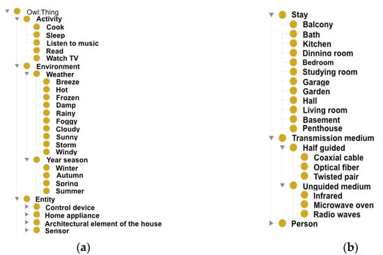 Figure 3. Domotic ontology: (a) Fragment 1, (b) Fragment 2.We also followed the Methontology method to develop the home automation ontology []. That is, we conducted different operations, each based on particular aspects of the conceptual model of knowledge: relationships, terms, axioms, taxonomy, rules, and mathematical approximations of elements. - Recommender system. This system issues recommendations for energy saving and home comfort based on home residents’ behavioral patterns. To this end, the system takes into account both daily and average energy consumption values from each domotic device, which allows the system to generate the rules in the algorithm. Therefore, smart homes are classified on a daily basis with respect to four energy consumption categories: normal, low, medium, and high. Once the classification is performed with the J48 algorithm, the rules are established according to energy consumption categories. In this sense, energy consumption is calculated with respect to the number domotic devices connected in a home, the average number of home residents, and the season (spring, summer, autumn, and winter). The algorithm rules identify and indicate how the energy-saving recommendation process works. We also used Apache Mahout and RuleML to generate energy-saving recommendations. Apache Mahout is a free software library that supports the scalable implementation of machine learning algorithms. On the other hand, RuleML is based on XML (Extensible Markup Language), which is used for the immediate exchange of rules. Finally, the recommender system of HEMS-IoT not only issues recommendations, but it also suggests IoT services to solve safety problems.