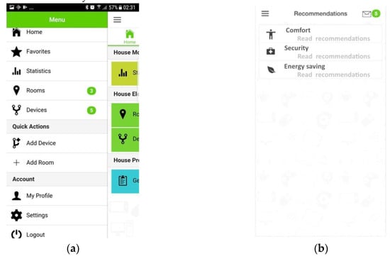 Interfaces of HEMS-IoT: (a) Menu, (b) Recommendations.