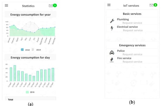Figure 5a shows a yearly graph and a weekly graph generated by HEMS-IoT. Graphs allow application users to visualize energy consumption data daily, weekly, monthly, or yearly. Additionally, as Figure 5b illustrates, the HEMS-IoT mobile app provides a set of user interfaces for home residents to view and request basic services available in the IoT (e.g., plumbing and electrical repairs). Thanks to the use of IoT technologies and machine learning techniques, HEMS-IoT helps residents to monitor their smart homes easily and in real-time and provides energy-saving recommendations accordingly.